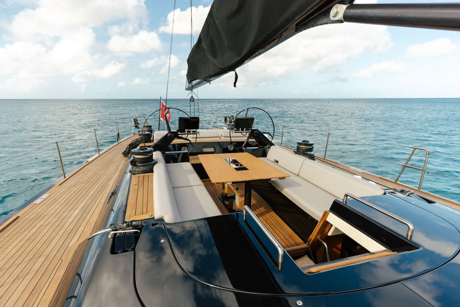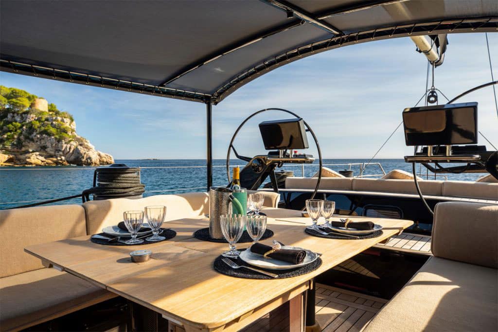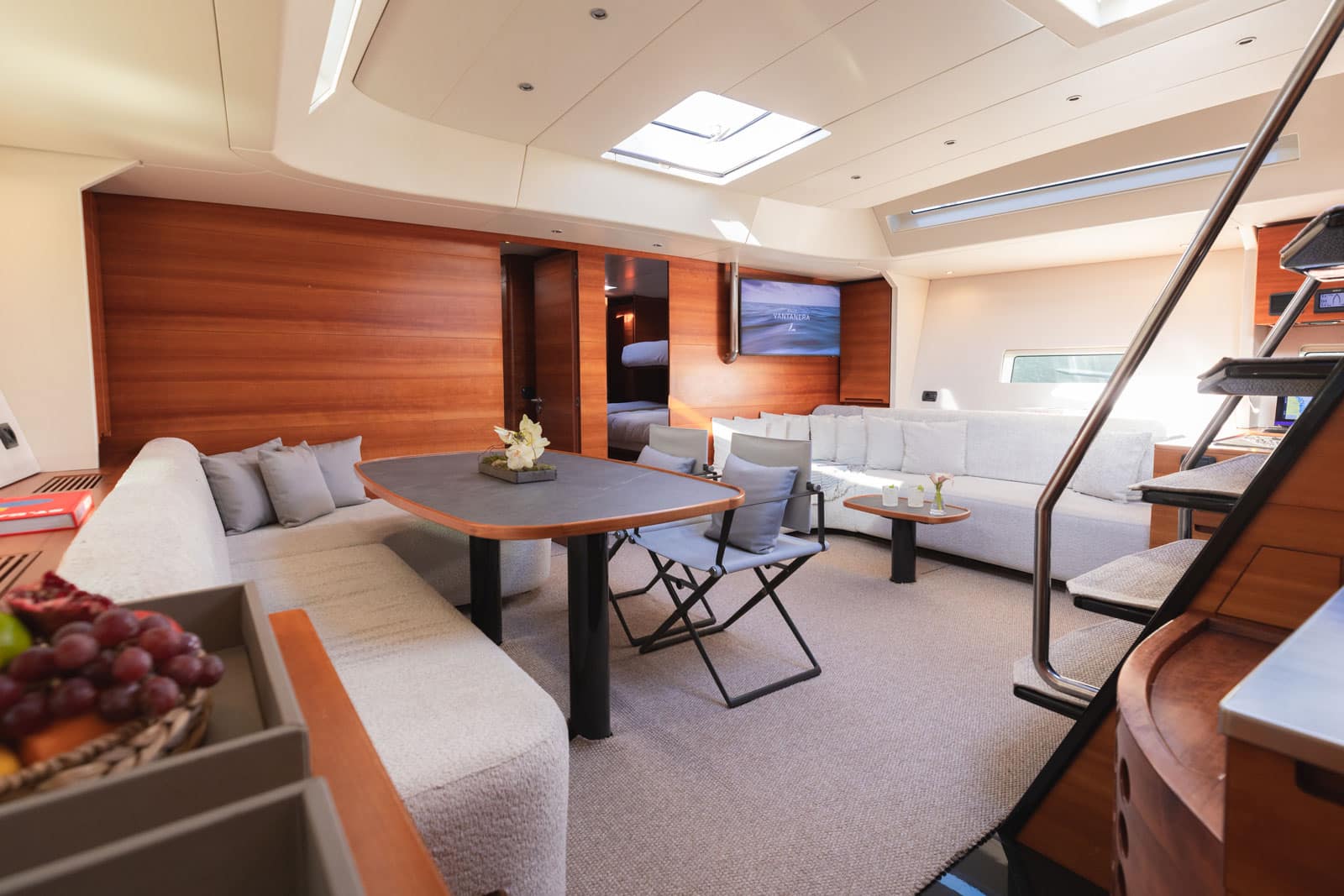 Vantanera’s expansive teak decks and wide side decks offer plenty of space for sunbathing, lounging, and taking in the views. The central cockpit is the heart of life onboard — with comfortable seating and a dining area perfect for alfresco meals or evening cocktails. Twin helms and a streamlined layout ensure smooth sailing, while a fold-down swim platform at the stern gives easy access to the water for swimming, snorkelling, or paddleboarding.