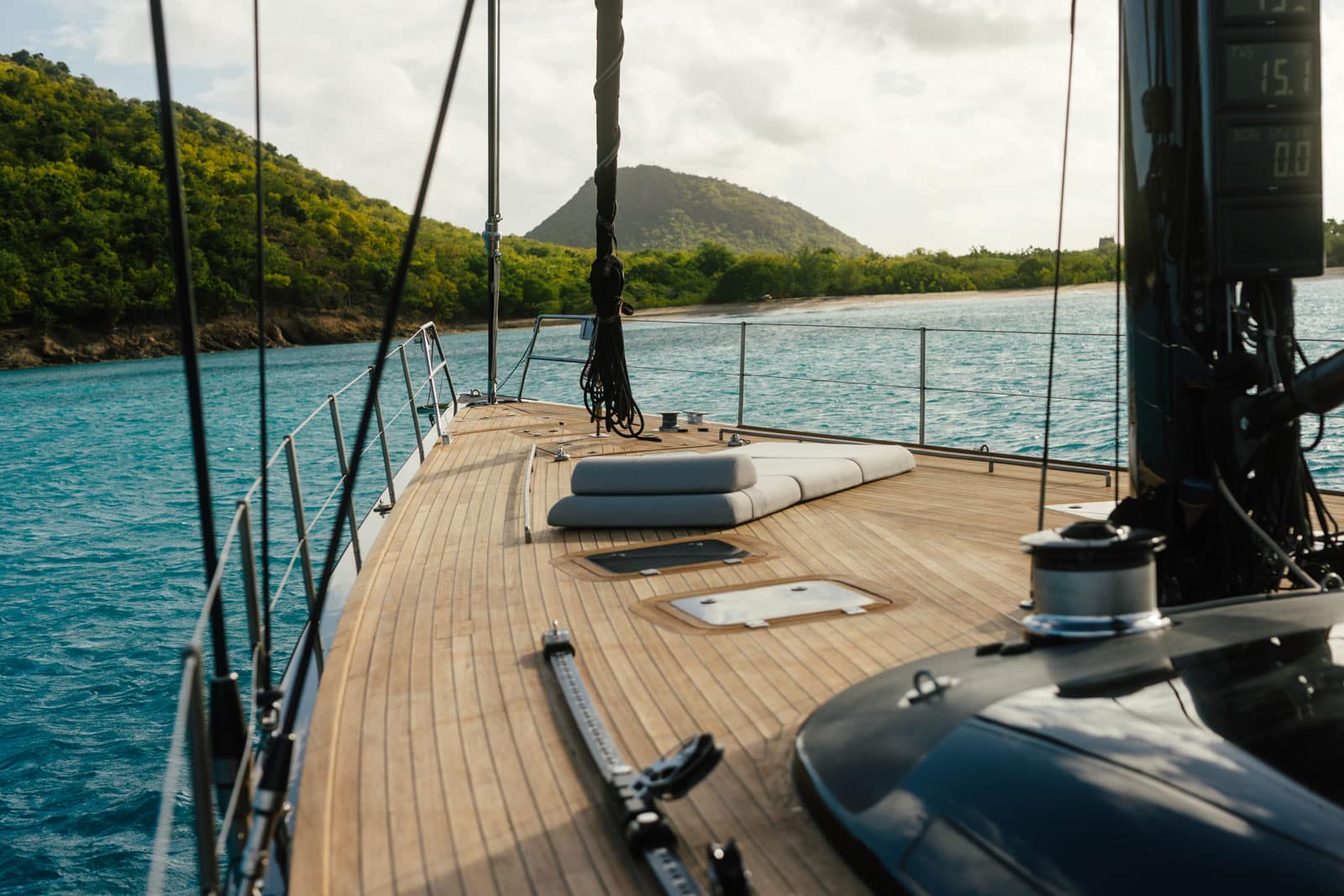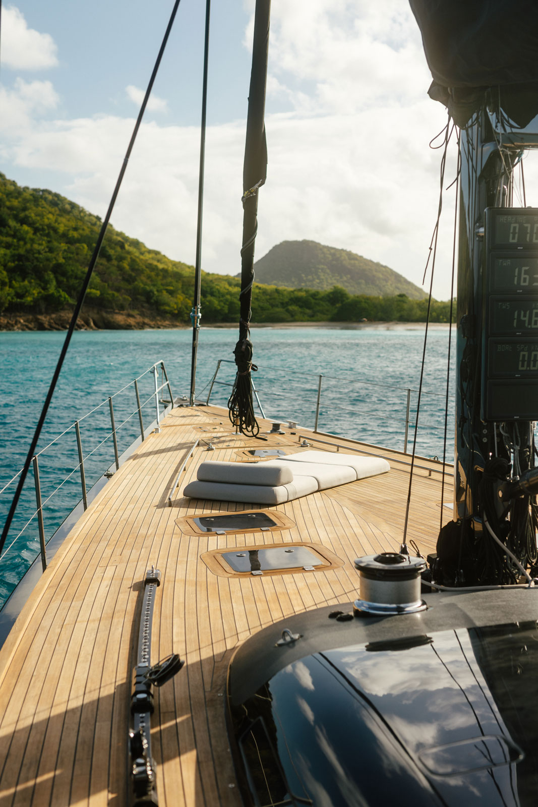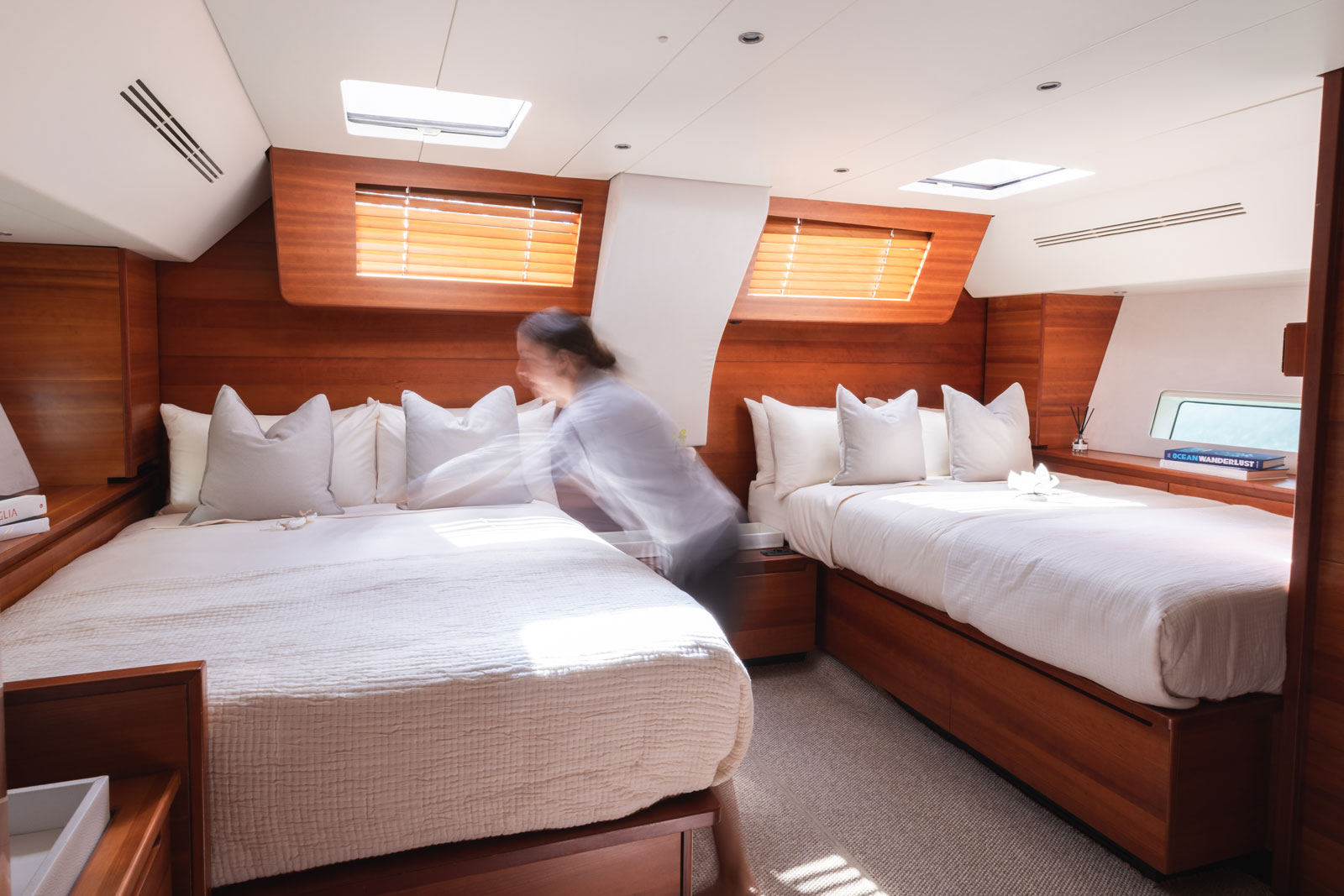 Vantanera’s expansive teak decks and wide side decks offer plenty of space for sunbathing, lounging, and taking in the views. The central cockpit is the heart of life onboard — with comfortable seating and a dining area perfect for alfresco meals or evening cocktails. Twin helms and a streamlined layout ensure smooth sailing, while a fold-down swim platform at the stern gives easy access to the water for swimming, snorkelling, or paddleboarding.