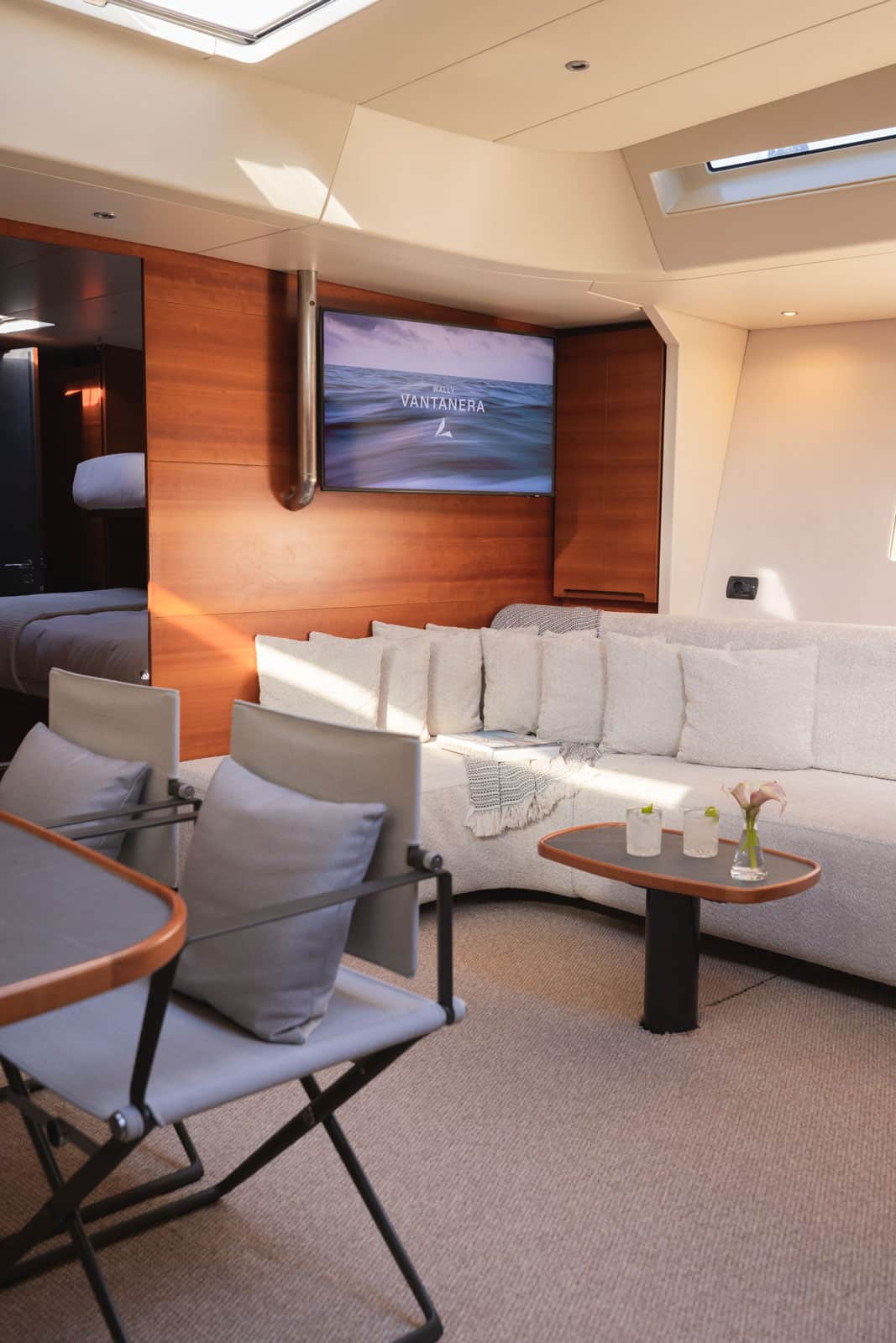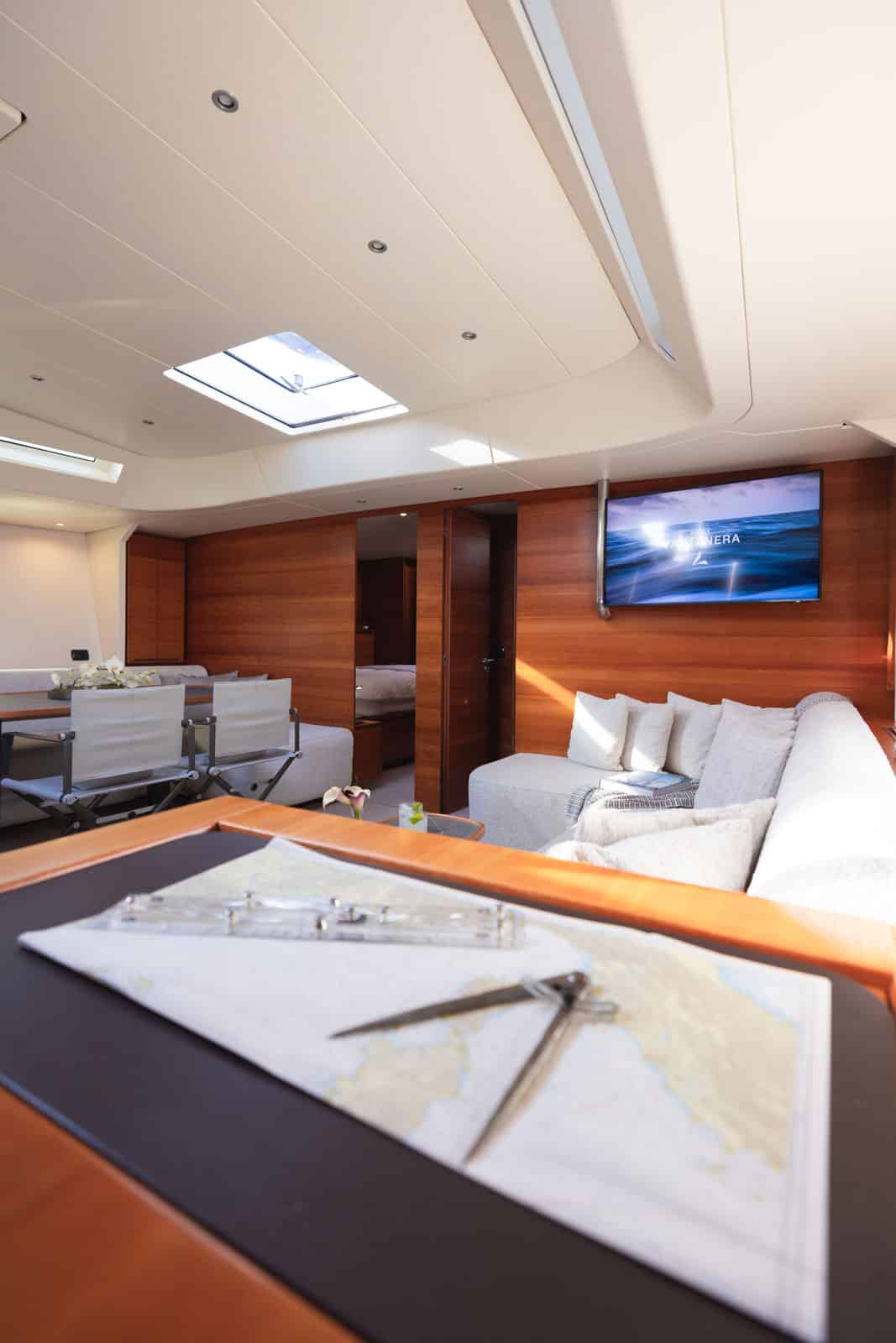 Step below and discover a light, contemporary interior where clean lines and thoughtful design create a welcoming atmosphere. Large windows flood the saloon with natural light, while the contrast of carbon details and soft furnishings adds a modern, stylish touch. The saloon features ample seating and a dining table, making it the perfect spot for a relaxed meal or a movie night after a day on the water.